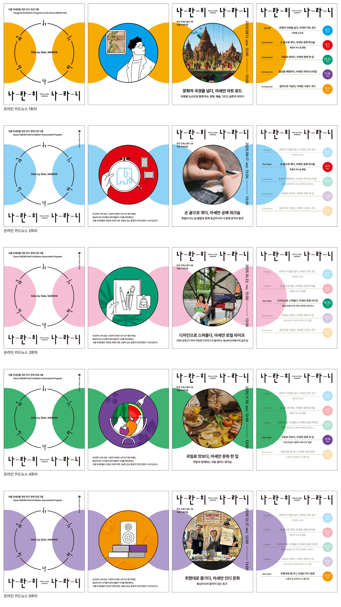 나란히 나라니나란히 아세안 나라 잇기를 부제로, 서울 아세안홀 개관 전시 푸릇 프룻, 과일이 있는 풍경〉과 연계해 아세안 회원국의 문화·예술적 가치를 재조명하는 프로그램이다. 본 프로그램의 기획・운영을 맡은 F.A.는 서울 아세안홀이 개관 이후 5개월간, 매달 하나의 주제를 선정해 전시 내용을 확장하고 아세안 국가의 문화와 예술에 대한 이해를 높이는 온라인・오프라인 통합 홍보 콘텐츠를 운영했다. 프로그램 기간 동안 온라인 콘텐츠 5건과 오프라인 콘텐츠 5건을 진행했으며, 텍스트 기반 미디어 그룹 ‘아워익스프레스’(인스타그램 팔로워 14.5만 명 보유)와 협업해 온·오프라인 콘텐츠를 기획했다.나란히 나라니의 온라인 콘텐츠는 총 50만 회 이상의 조회수를 기록했으며, 서울 아세안홀 전시장에서 진행된 오프라인 콘텐츠에는 100여 명의 시민이 참여해 아세안 문화의 다양한 면모를 경험했다.