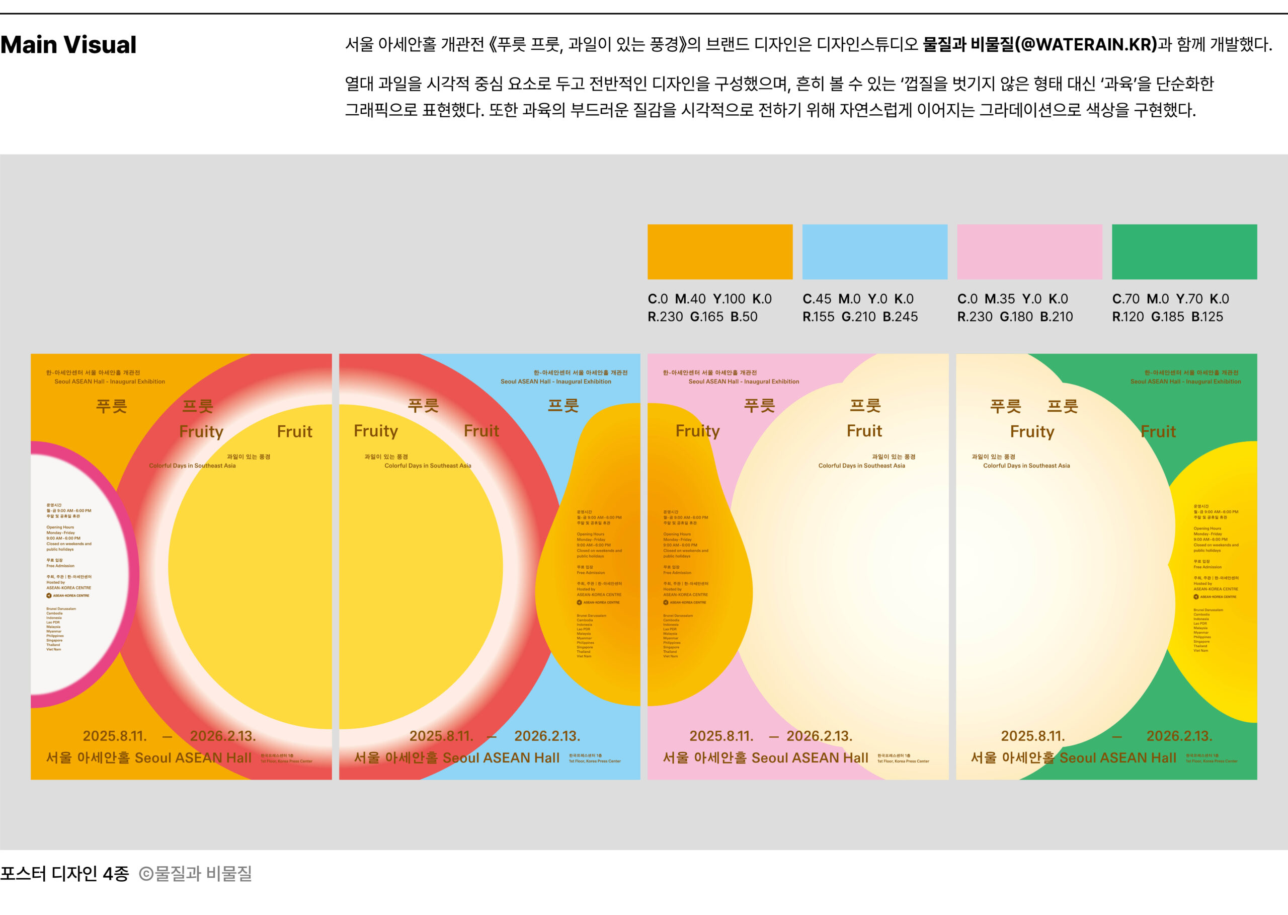 서울 아세안홀의 개관을 알리는 첫 전시 《푸릇 프룻, 과일이 있는 풍경》은 아세안 10개국의 지지와 협력을 바탕으로 수집된 상설품과 기증품을 중심으로, 열대 과일이라는 매개를 통해 동시대 삶의 환경과 일상의 아름다움을 담아냈다. F.A.는 개막식과 전시 연계프로그램 ‘나란히 나라니’를 비롯해 약 6개월 간 전시장을 운영하며 전시를 성공적으로 이끌었다. 또한 전시 도록·기념품 디자인, 온·오프라인 홍보를 함께 진행하며 개막 첫 달 약 2,000명의 관람객 기록과 더불어 아세안 국가의 문화에 대한 대중 인지도 향상이라는 성과를 얻었다.